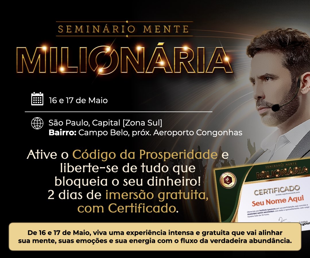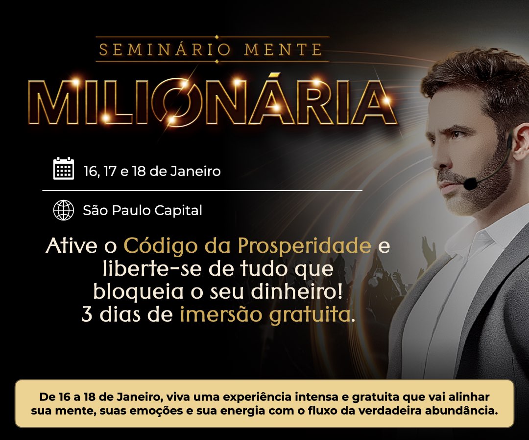 Durante 3 dias transformadores que irão revelar os segredos da Mente Milionária e as ferramentas que estão mudando vidas no Brasil e no exterior.
